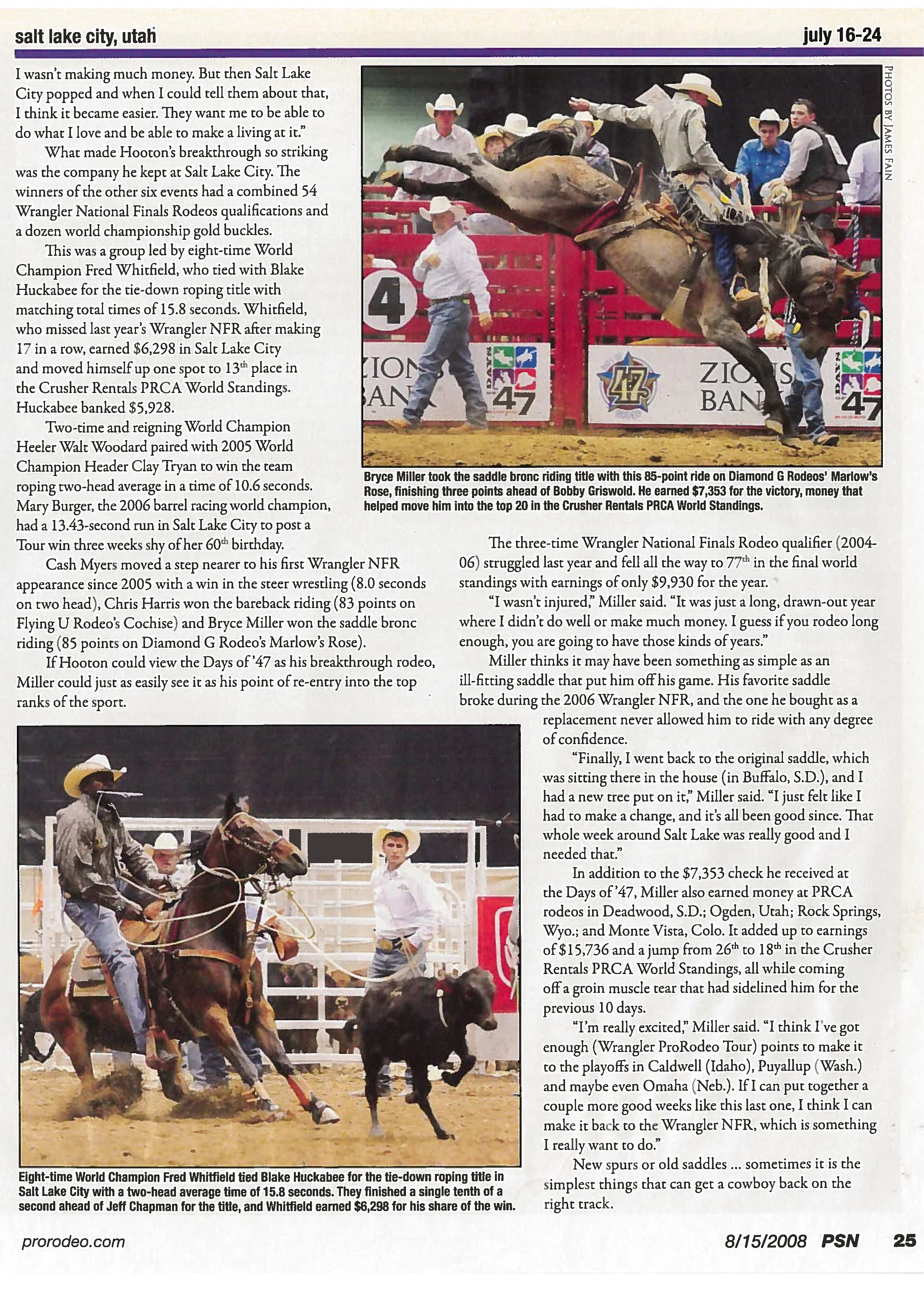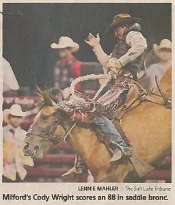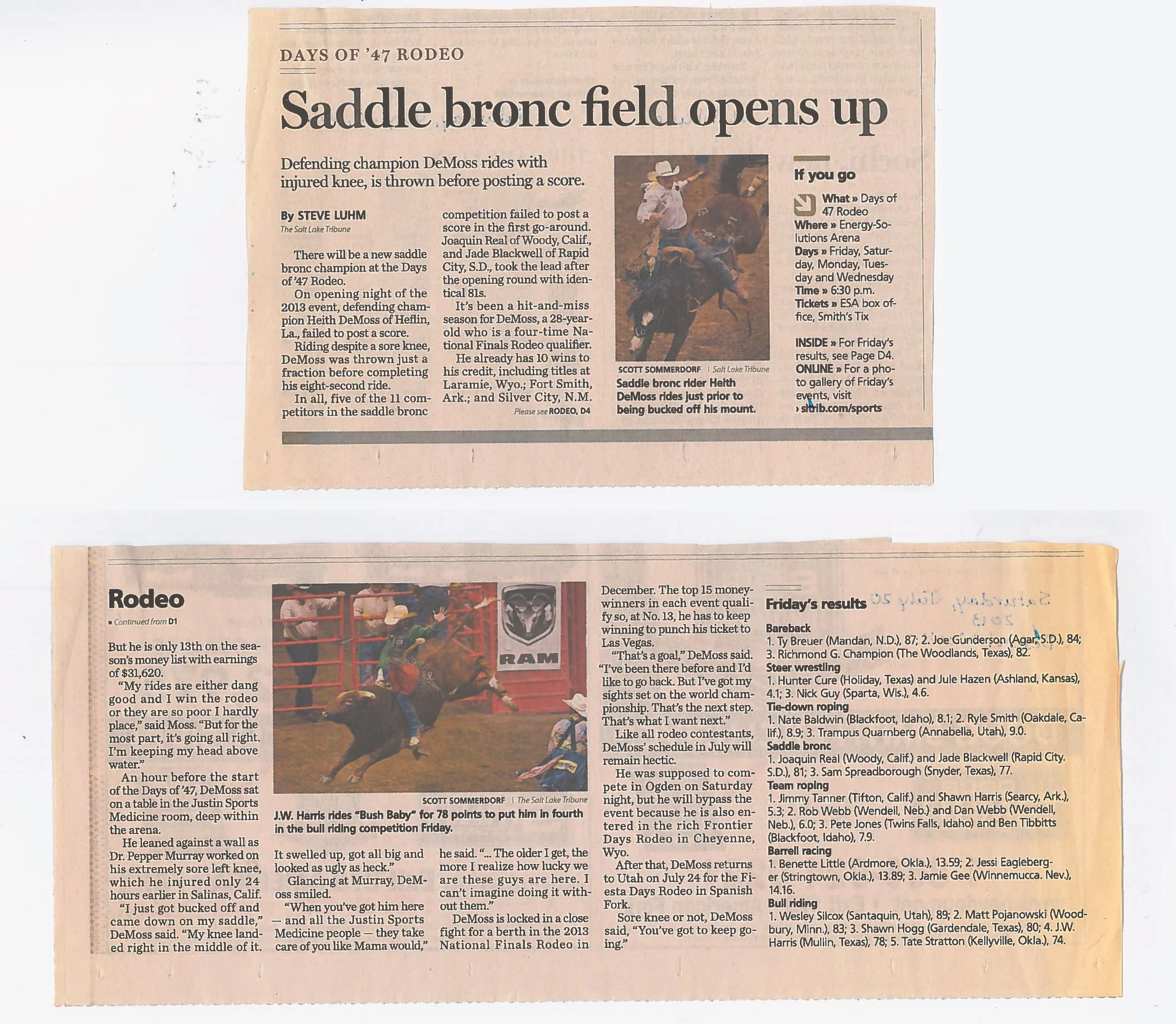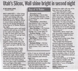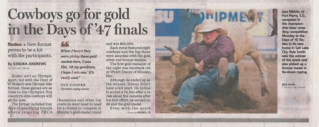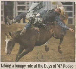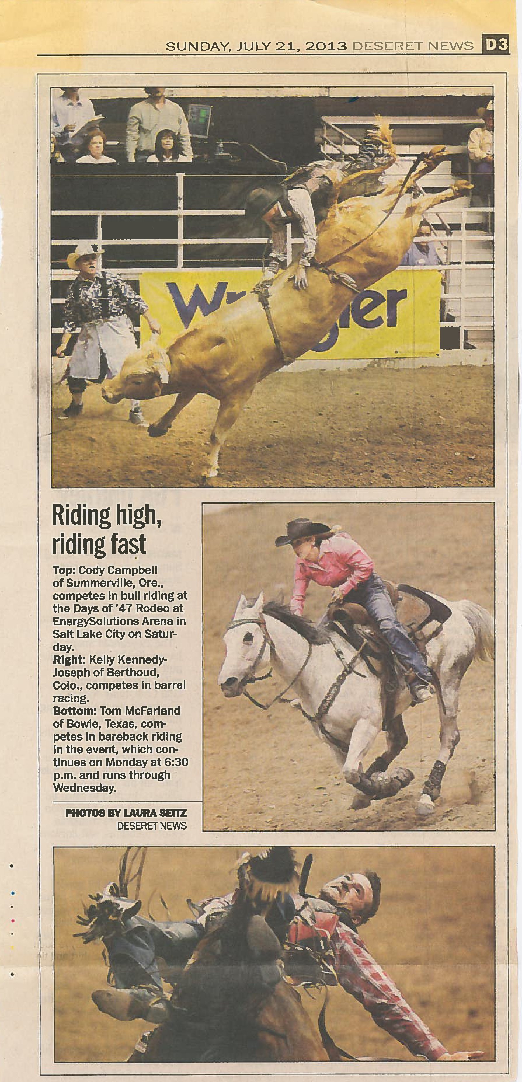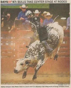 Days of ’47 Rodeos Cowboys go for the gold in Days of ’47 Rodeo finals View fullsize Salt Lake Tribune – Monday, July 24, 2017 Vezain’s ‘dang good ride’ on wild horse puts him in first at Days of ’47 Rodeo View fullsize Deseret News – Thursday, July 20, 2017 Back in the saddle again View fullsize Salt Lake Tribune Sports News – Friday, July 22, 2016 Face-To-Face View fullsize ProRodeo Sports News – Friday, August 28, 2015 Wright On View fullsize ProRodeo Sports News – Friday, August 14, 2015 Rusty Wright steals show during final leg of rodeo View fullsize Deseret News – Sunday, July 26, 2015 After Days of ’47 win, Wright eyes nationals View fullsize Salt Lake Tribune – Sunday, July 26, 2015 Tour ends badly for saddle bronc rider View fullsize Salt Lake Tribune – Saturday, July 25, 2015 3 new overall leaders emerge in Friday’s rodeo View fullsize Deseret News – Saturday, July 25, 2015 Stacked bull riding field highlights Days of ’47 View fullsize Deseret News – Friday, July 24, 2015 Aussie-Texan looks to move off the bubble View fullsize Salt Lake Tribune – Friday, July 24, 2015 Utah’s Silcox, Wall shine bright in second night View fullsize Deseret News – Thursday, July 23, 2015 Utahn still alive after Undertaker View fullsize Salt Lake Tribune – Thursday, July 23, 2015 Hanging in there View fullsize Salt Lake Tribune – Tuesday, July 21, 2015 Revived Days of ’47 Rodeo wraps up View fullsize Salt Lake Tribune – Sunday, July 27, 2014 Feild can feel home crowd’s energy at ESA View fullsize Deseret News – Sunday, July 27, 2014 Two Utahns steal spotlight at Days of ’47 View fullsize Salt Lake Tribune – Saturday, July 26, 2014 All smiles for cowboys and rodeo View fullsize Deseret News – Saturday, July 26, 2014 Utah’s Caleb Bennett sits in 2nd place View fullsize Deseret News – Thursday, July 24, 2014 Bulls dominate in second round at Days of ’47 Rodeo View fullsize Salt Lake Tribune – Thursday, July 24, 2014 Casey Martin View fullsize Salt Lake Tribune – Wednesday, July 23, 2014 Iowan O’Connell keeps rolling in bareback View fullsize Salt Lake Tribune – Wednesday, July 23, 2014 Taking a bumpy ride at the Days of ’47 Rodeo View fullsize Deseret News – Wednesday, July 23, 2014 Take the ride of your life View fullsize Deseret News – Monday, July 21, 2014 Home, Feild’s advantage View fullsize Salt Lake Tribune – Monday, July 21, 2014 Riding high, riding fast/Magic Wand and Cody Campbell View fullsize Deseret News – Sunday, July 21, 2013 A little friendly advice View fullsize Salt Lake Tribune – Sunday, July 21, 2013 Saddle bronc field opens up View fullsize Salt Lake Tribune – Friday, July 19, 2013 Cowboys’ concord View fullsize Salt Lake Tribune – Sunday, July 20, 2008 Bryce Miller on Marla’s Rose View fullsize Prorodeo.com Magazine – July 16-24, 2008 New kid on the block View fullsize PSN – August 6, 2003 Bull Riding Saddles DC Crowd with Thrills View fullsize Salt Lake Tribune – January 1, 1998