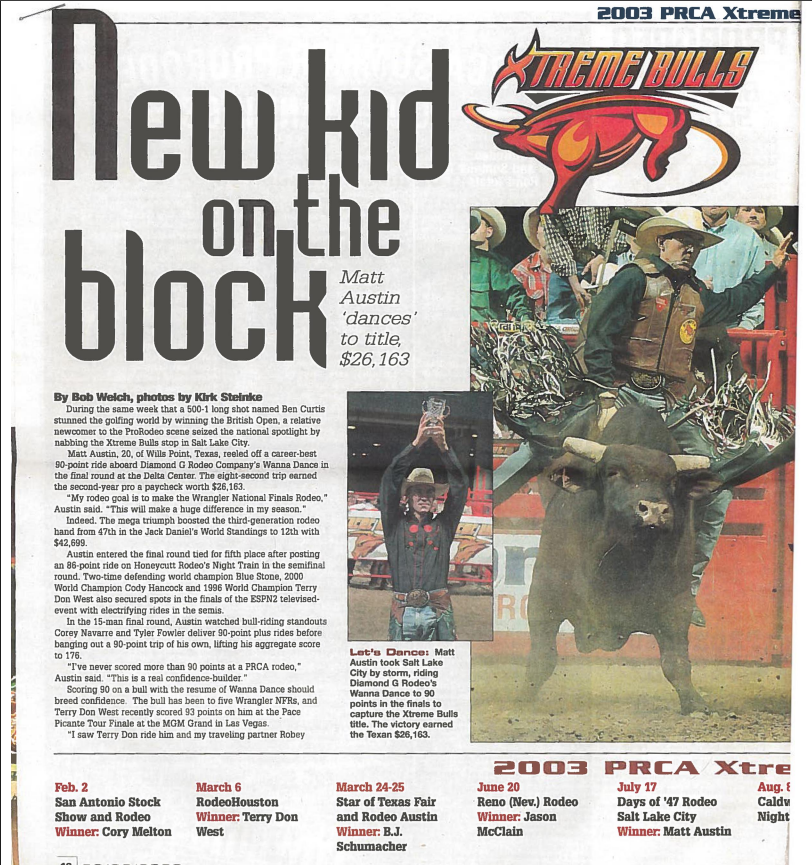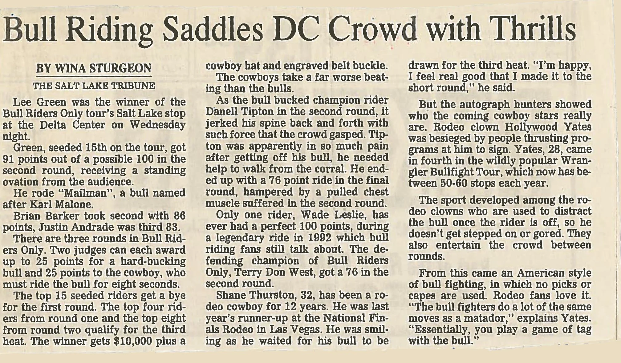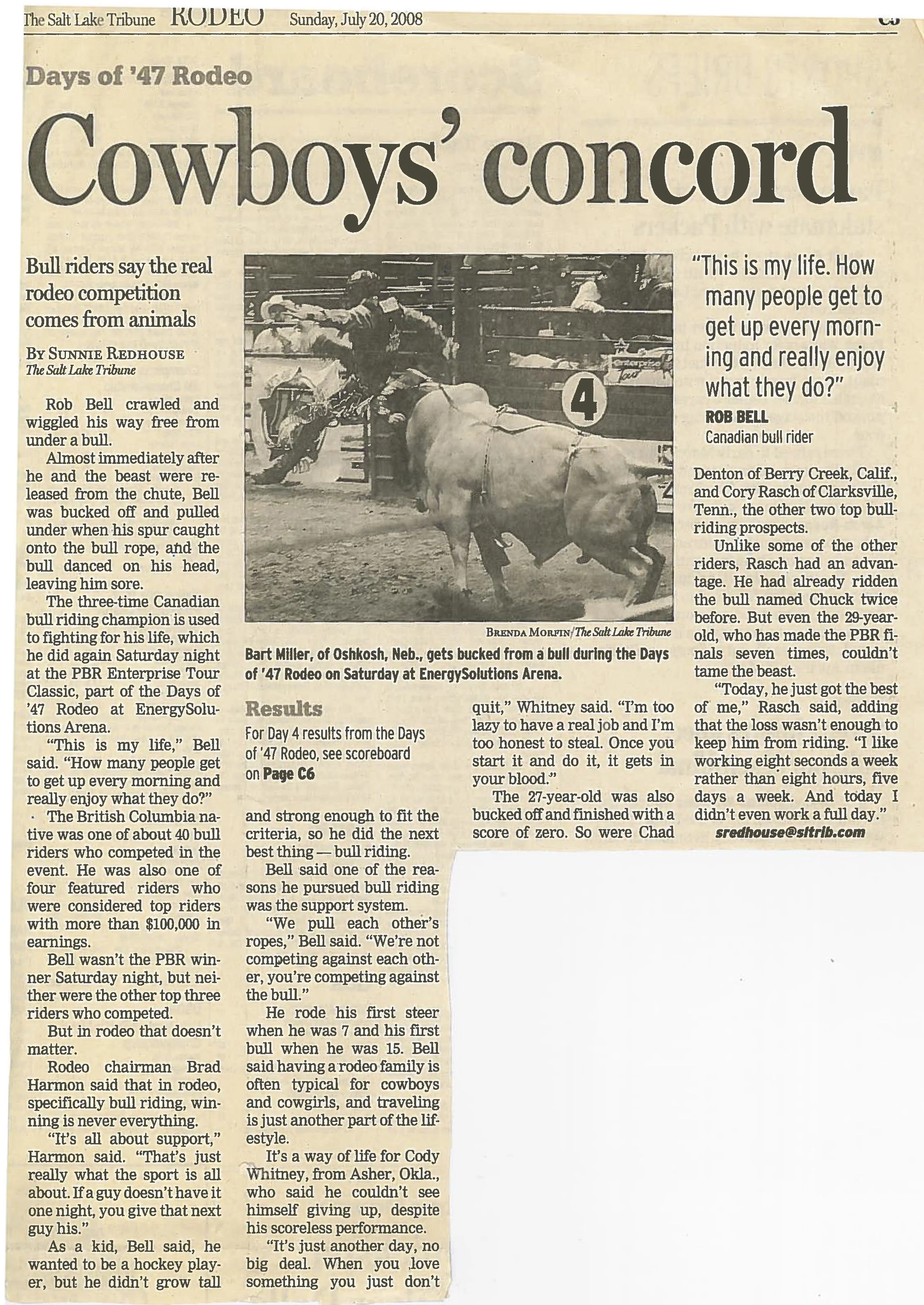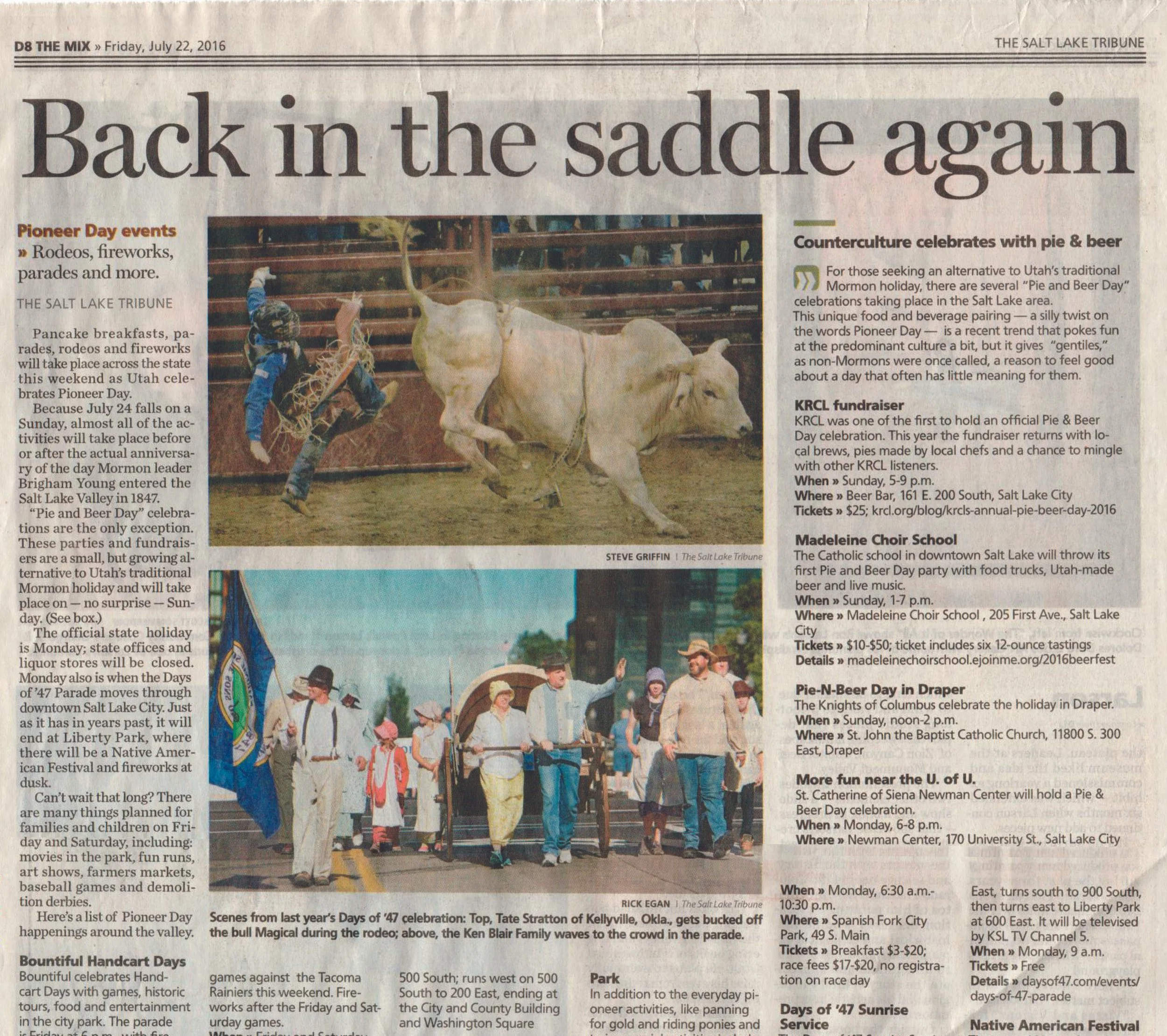 Days of ’47 Rodeos Cowboys go for the gold in Days of ’47 Rodeo finals View fullsize Salt Lake Tribune – Monday, July 24, 2017 Vezain’s ‘dang good ride’ on wild horse puts him in first at Days of ’47 Rodeo View fullsize Deseret News – Thursday, July 20, 2017 Back in the saddle again View fullsize Salt Lake Tribune Sports News – Friday, July 22, 2016 Face-To-Face View fullsize ProRodeo Sports News – Friday, August 28, 2015 Wright On View fullsize ProRodeo Sports News – Friday, August 14, 2015 Rusty Wright steals show during final leg of rodeo View fullsize Deseret News – Sunday, July 26, 2015 After Days of ’47 win, Wright eyes nationals View fullsize Salt Lake Tribune – Sunday, July 26, 2015 Tour ends badly for saddle bronc rider View fullsize Salt Lake Tribune – Saturday, July 25, 2015 3 new overall leaders emerge in Friday’s rodeo View fullsize Deseret News – Saturday, July 25, 2015 Stacked bull riding field highlights Days of ’47 View fullsize Deseret News – Friday, July 24, 2015 Aussie-Texan looks to move off the bubble View fullsize Salt Lake Tribune – Friday, July 24, 2015 Utah’s Silcox, Wall shine bright in second night View fullsize Deseret News – Thursday, July 23, 2015 Utahn still alive after Undertaker View fullsize Salt Lake Tribune – Thursday, July 23, 2015 Hanging in there View fullsize Salt Lake Tribune – Tuesday, July 21, 2015 Revived Days of ’47 Rodeo wraps up View fullsize Salt Lake Tribune – Sunday, July 27, 2014 Feild can feel home crowd’s energy at ESA View fullsize Deseret News – Sunday, July 27, 2014 Two Utahns steal spotlight at Days of ’47 View fullsize Salt Lake Tribune – Saturday, July 26, 2014 All smiles for cowboys and rodeo View fullsize Deseret News – Saturday, July 26, 2014 Utah’s Caleb Bennett sits in 2nd place View fullsize Deseret News – Thursday, July 24, 2014 Bulls dominate in second round at Days of ’47 Rodeo View fullsize Salt Lake Tribune – Thursday, July 24, 2014 Casey Martin View fullsize Salt Lake Tribune – Wednesday, July 23, 2014 Iowan O’Connell keeps rolling in bareback View fullsize Salt Lake Tribune – Wednesday, July 23, 2014 Taking a bumpy ride at the Days of ’47 Rodeo View fullsize Deseret News – Wednesday, July 23, 2014 Take the ride of your life View fullsize Deseret News – Monday, July 21, 2014 Home, Feild’s advantage View fullsize Salt Lake Tribune – Monday, July 21, 2014 Riding high, riding fast/Magic Wand and Cody Campbell View fullsize Deseret News – Sunday, July 21, 2013 A little friendly advice View fullsize Salt Lake Tribune – Sunday, July 21, 2013 Saddle bronc field opens up View fullsize Salt Lake Tribune – Friday, July 19, 2013 Cowboys’ concord View fullsize Salt Lake Tribune – Sunday, July 20, 2008 Bryce Miller on Marla’s Rose View fullsize Prorodeo.com Magazine – July 16-24, 2008 New kid on the block View fullsize PSN – August 6, 2003 Bull Riding Saddles DC Crowd with Thrills View fullsize Salt Lake Tribune – January 1, 1998