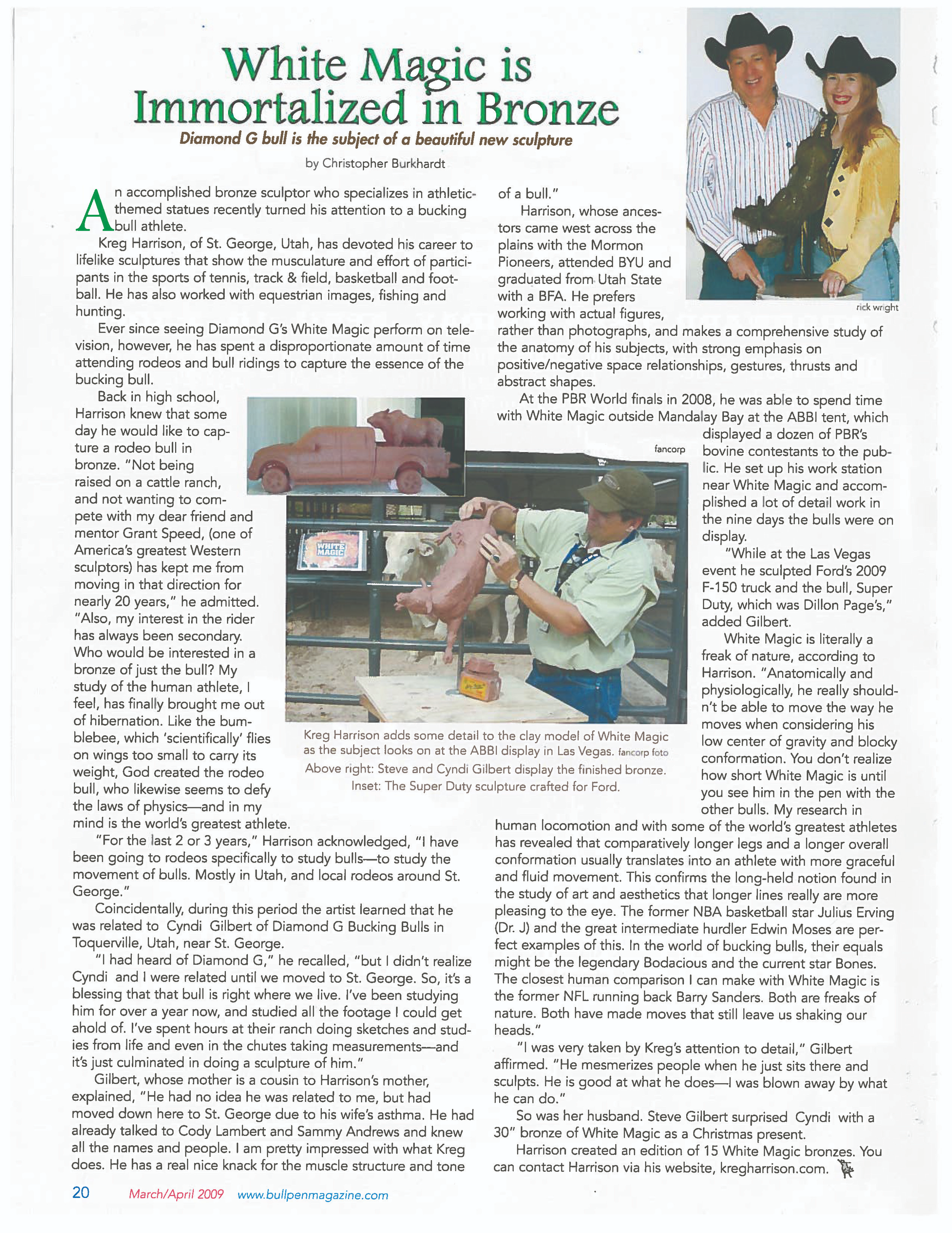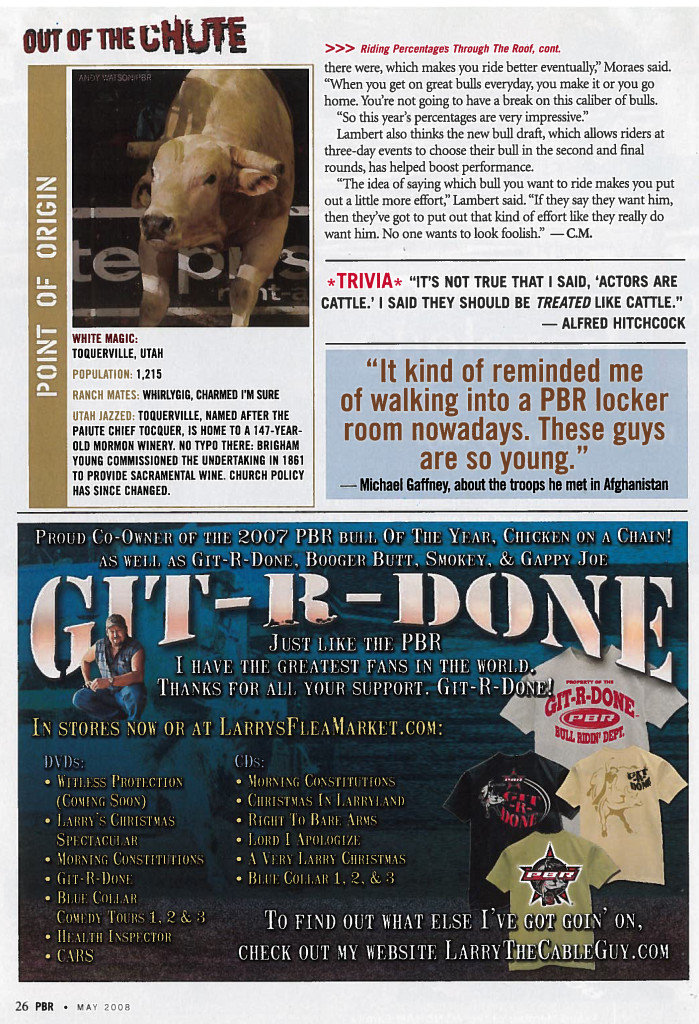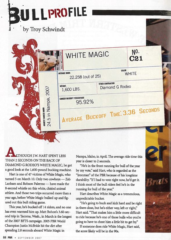 A double-bred bull from Ricky grandfather (sire) and great grandfather (dam), White Magic was the bull that opened the door to the PBR for the Gilberts and is still alive today. The mascot of Diamond “G” Ranch, his personality and legacy are stark reminders of Diamond G.