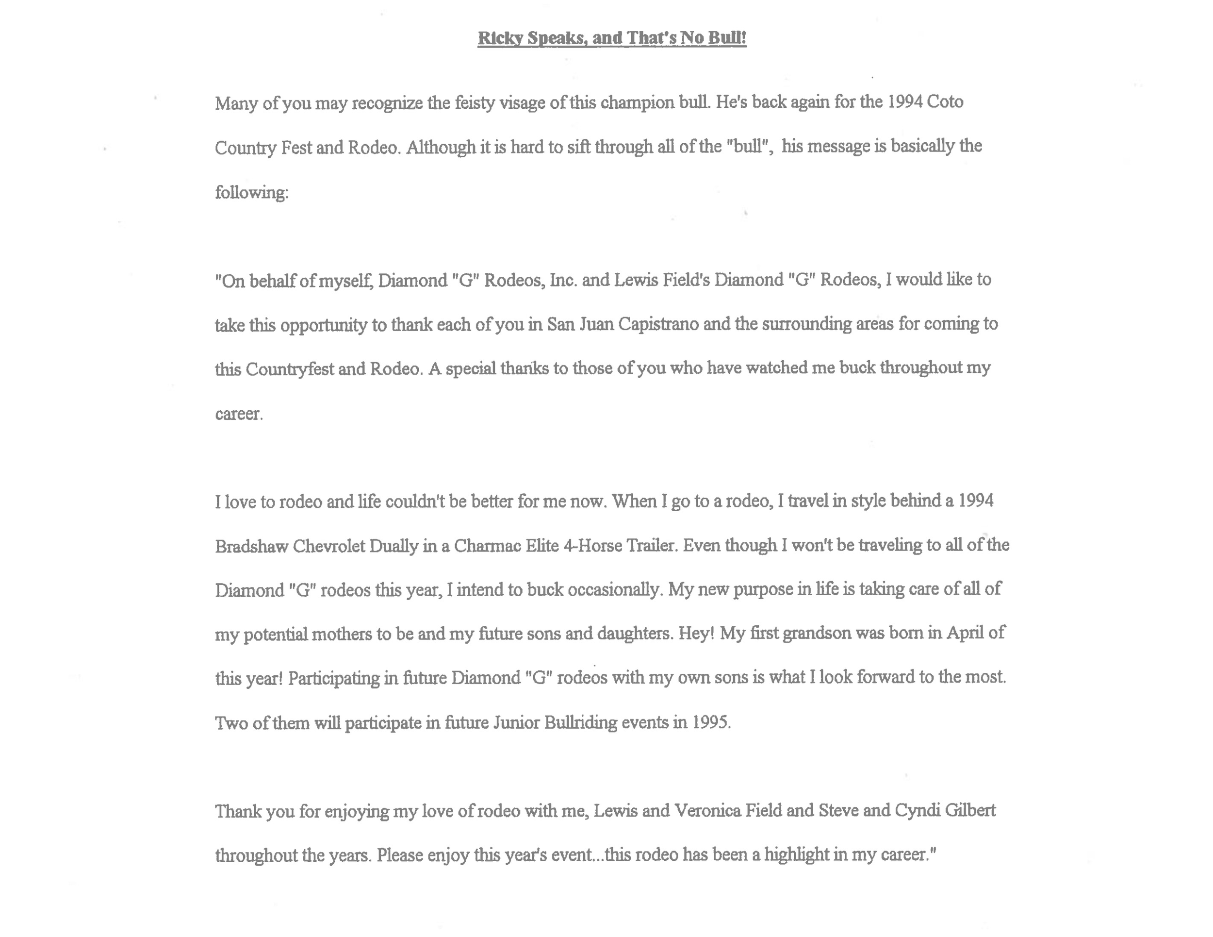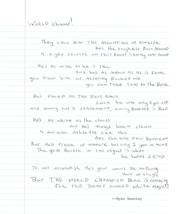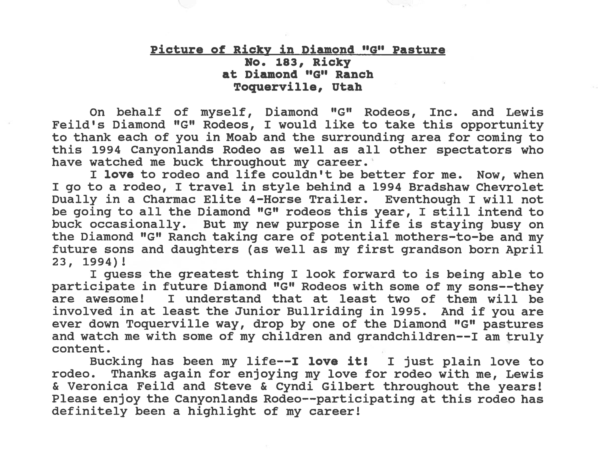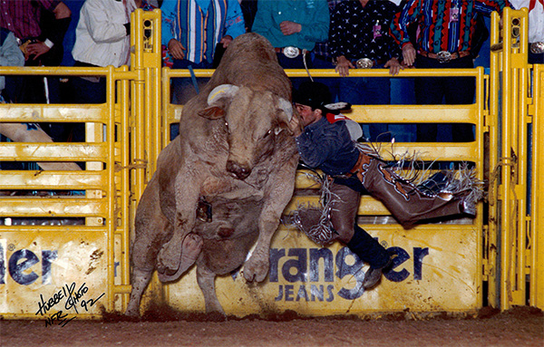 “Steve’s bull” and Diamond G’s first superstar, Ricky is the cornerstone for dozens of Diamond G’s best-bred animals. For example, Ricky is both the grandfather (sire) and great grandfather (dam) of White Magic. When Norman Curry rode Ricky in the 10th Go of the 1990 WNFR for 94 points, Ricky had gone 309 trips unridden—over 10 world champions and a whole slew of cowboys (i.e. Jim Sharp, Clint Branger, Michael Gaffney, Darryl Mills, Cody Custer, Gilbert Carillo, Adam Carillo, Scott Mendes, Tuff Hedeman, Terry Don West, and others) were never able to conquer him. Ricky traveled from coast to coast and sometimes had several outs per day. His heart never weakened—he actively bucked in the PRCA until he was 15 years old. When he retired he had been ridden a total of 7 times in almost 400 outs. On the day that he died, March 23, 2000, 4 Ricky calves were born. Although initially thought to be sterile, over 100 offspring were born during his lifetime.