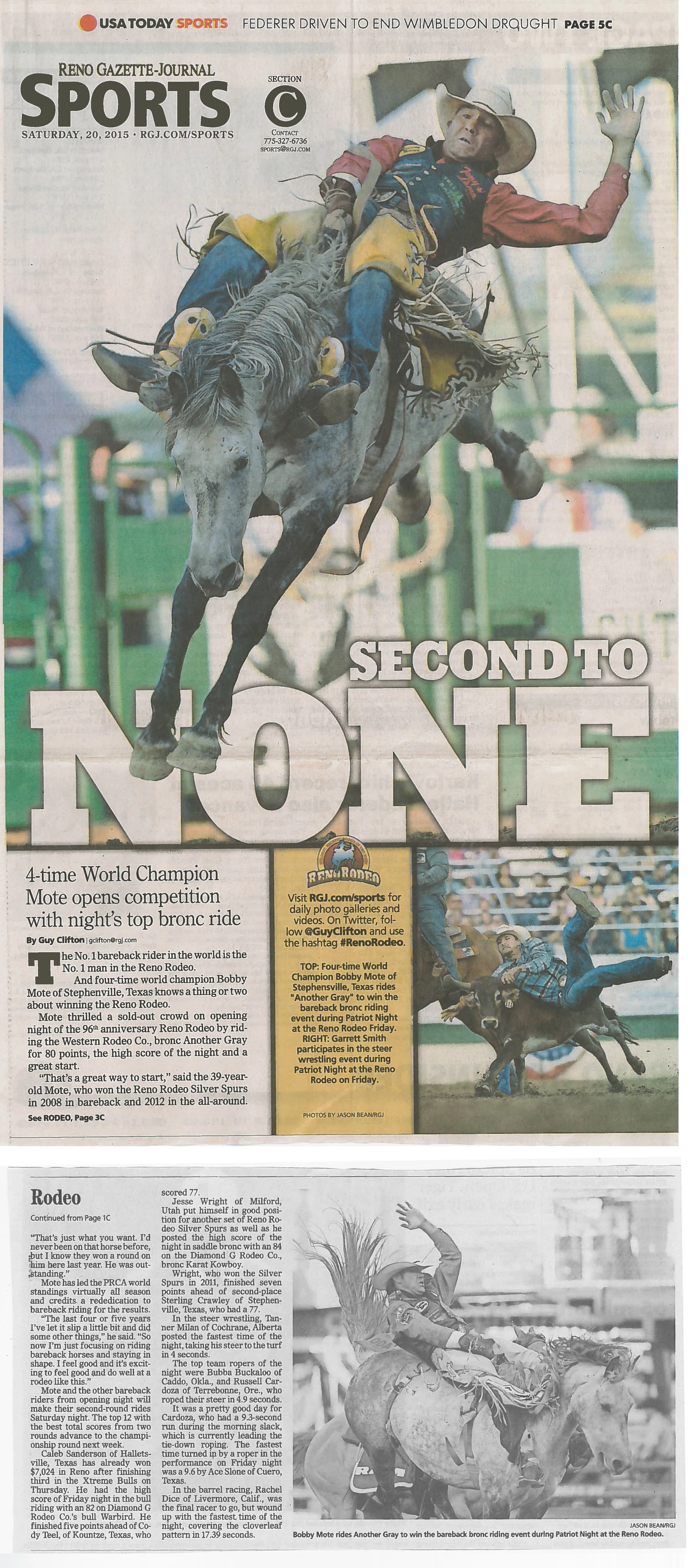Reno Rodeo News Articles Reno Rodeo Night 2 Highlights & Results View fullsize Friday, June 24, 2016 First Reno Rodeo Performance View fullsize June 17, 2016 Bradley Harter View fullsize June 27, 2015 Head to Head View fullsize Reno Gazette-Journal – Friday, June 19, 2015 Second to None View fullsize Reno Gazette-Journal – Saturday, June 20, 2015