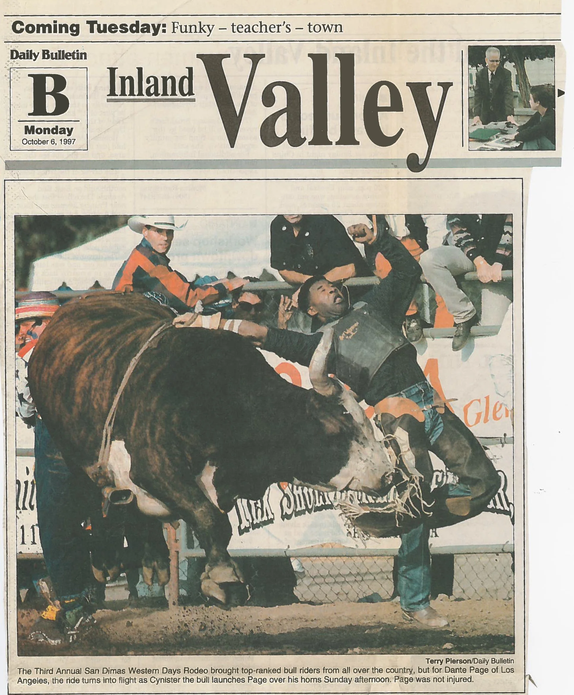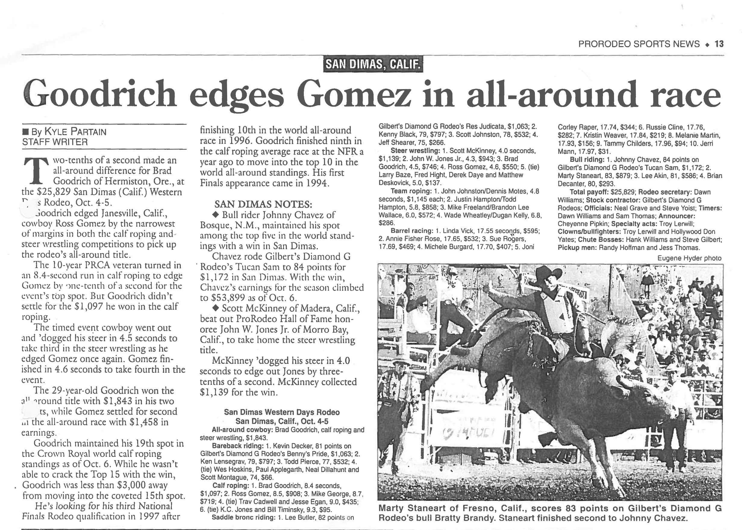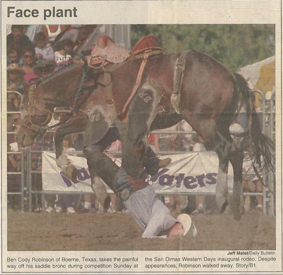 San Dimas Western Days News Articles Rides turns into a fight View fullsize Daily Bulletin – October 6, 1997 Goodrich edges Gomez in all-around race View fullsize ProRodeo Sports News – 1997 Face plant View fullsize Daily Bulletin – October 8, 1995