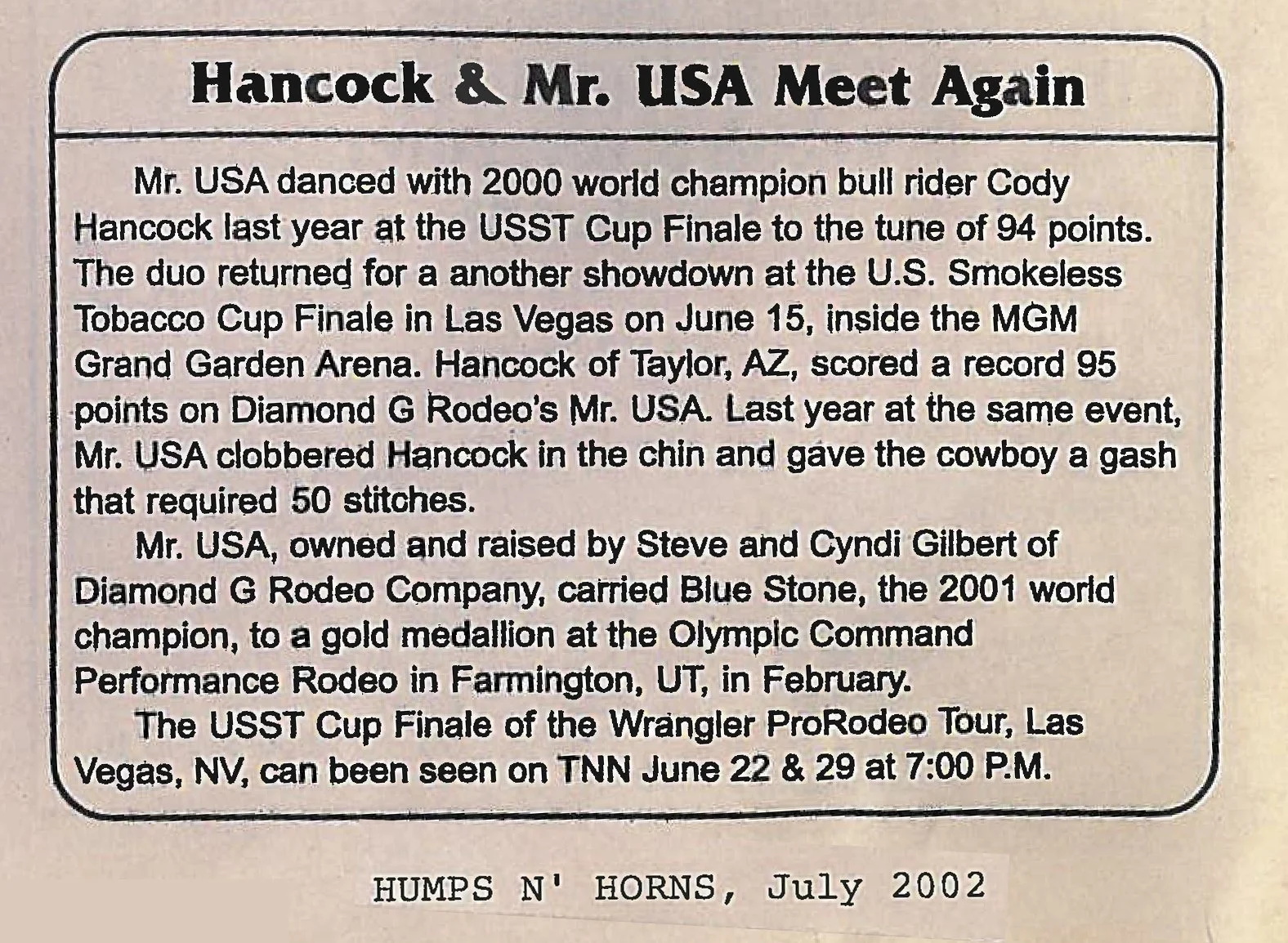 Tour Finale Vegas Victory View fullsize PSN ā June 16, 2000 Hancock & Mr. USA Meet Again View fullsize Humps Nā Horns- July 2002